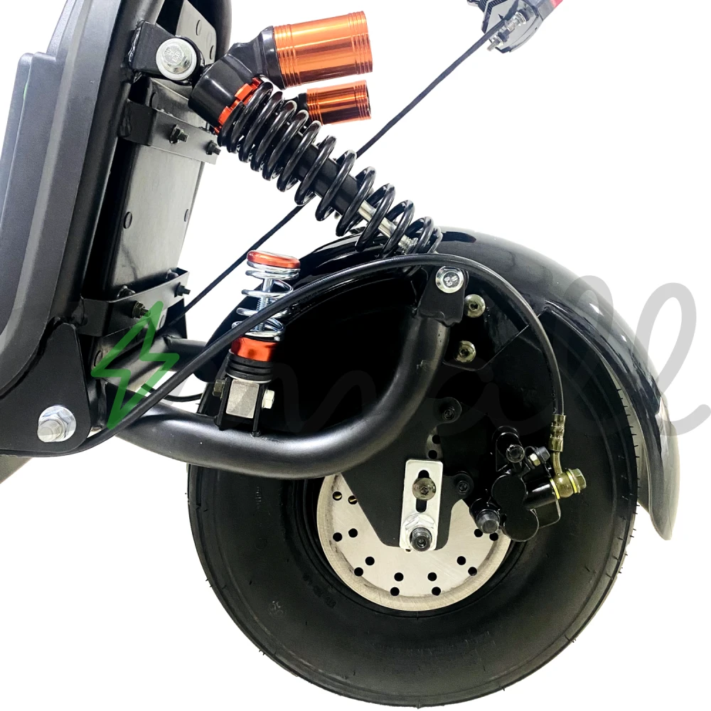 Алюминиевая конструкция рамы благодаря инновационному материалу без труда выдерживает грузоподъемность взрослого человека в 120 кг. Мощностные параметры электродвижка – 1200 Вт и емкая батарея в 15А*ч достаточна для развития скорости 40 км/час и преодоления дистанции в 35 км. Своевременность торможения обеспечена двумя дисковыми тормозами. Комфорт и удобство езды комфортабельным мягким седлом и широкой платформой для ног. Производитель предпринял максимум решений, чтобы райдер испытывал только комфорт.